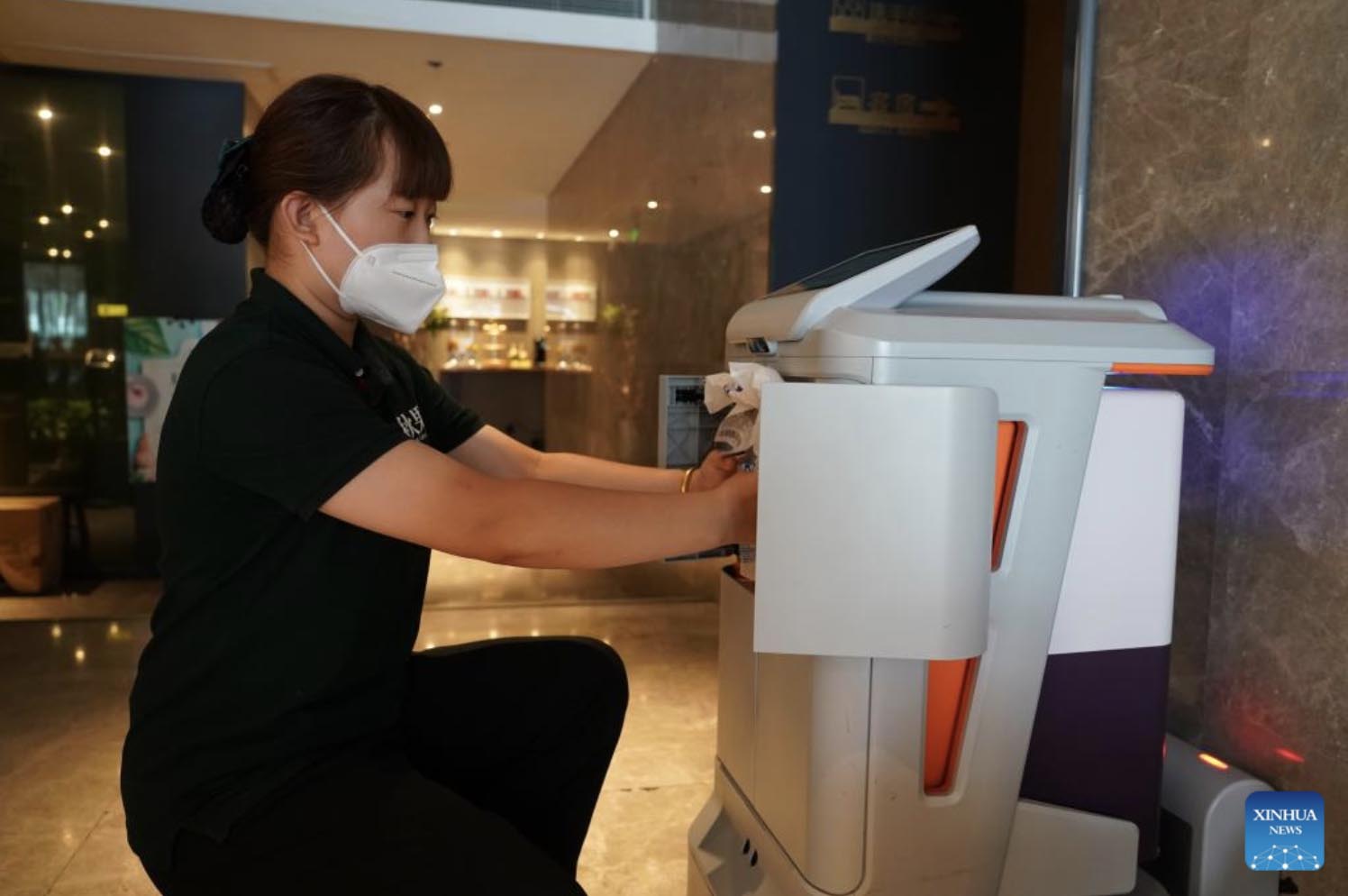 A staff member puts items for delivery inside a service robot at a hotel in Chaoyang District of Beijing, capital of China, Aug. 13, 2022. (Xinhua/Ren Chao)