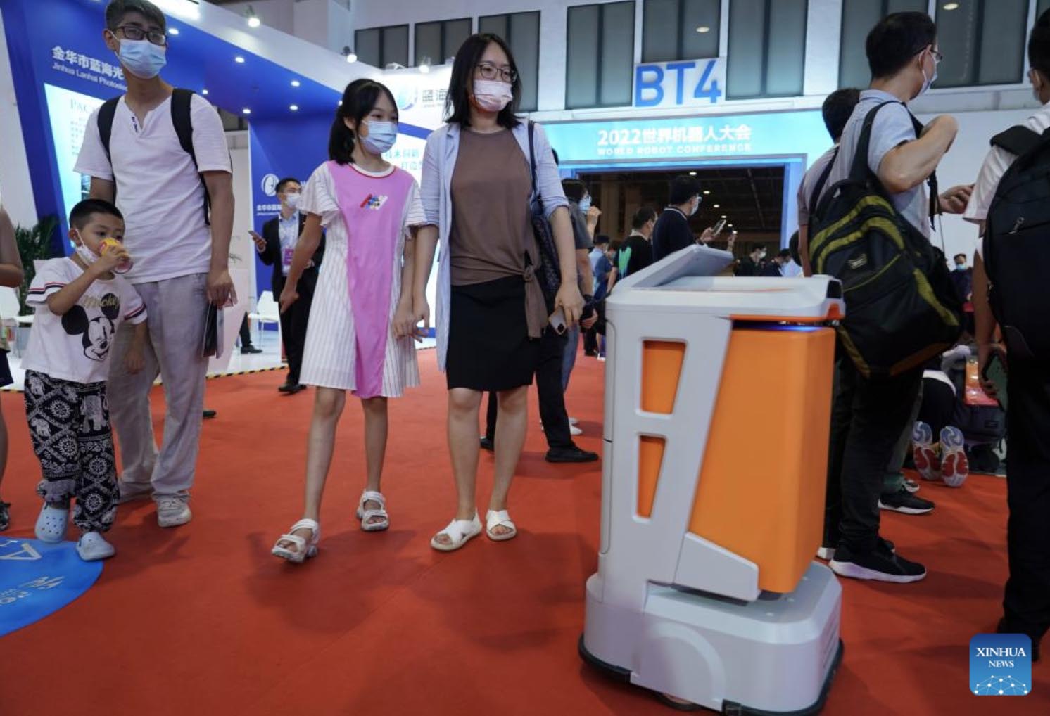 A service robot is seen during an expo of the World Robot Conference 2022 (WRC 2022) in Beijing, capital of China, Aug. 18, 2022. (Xinhua/Zhao Tingting)