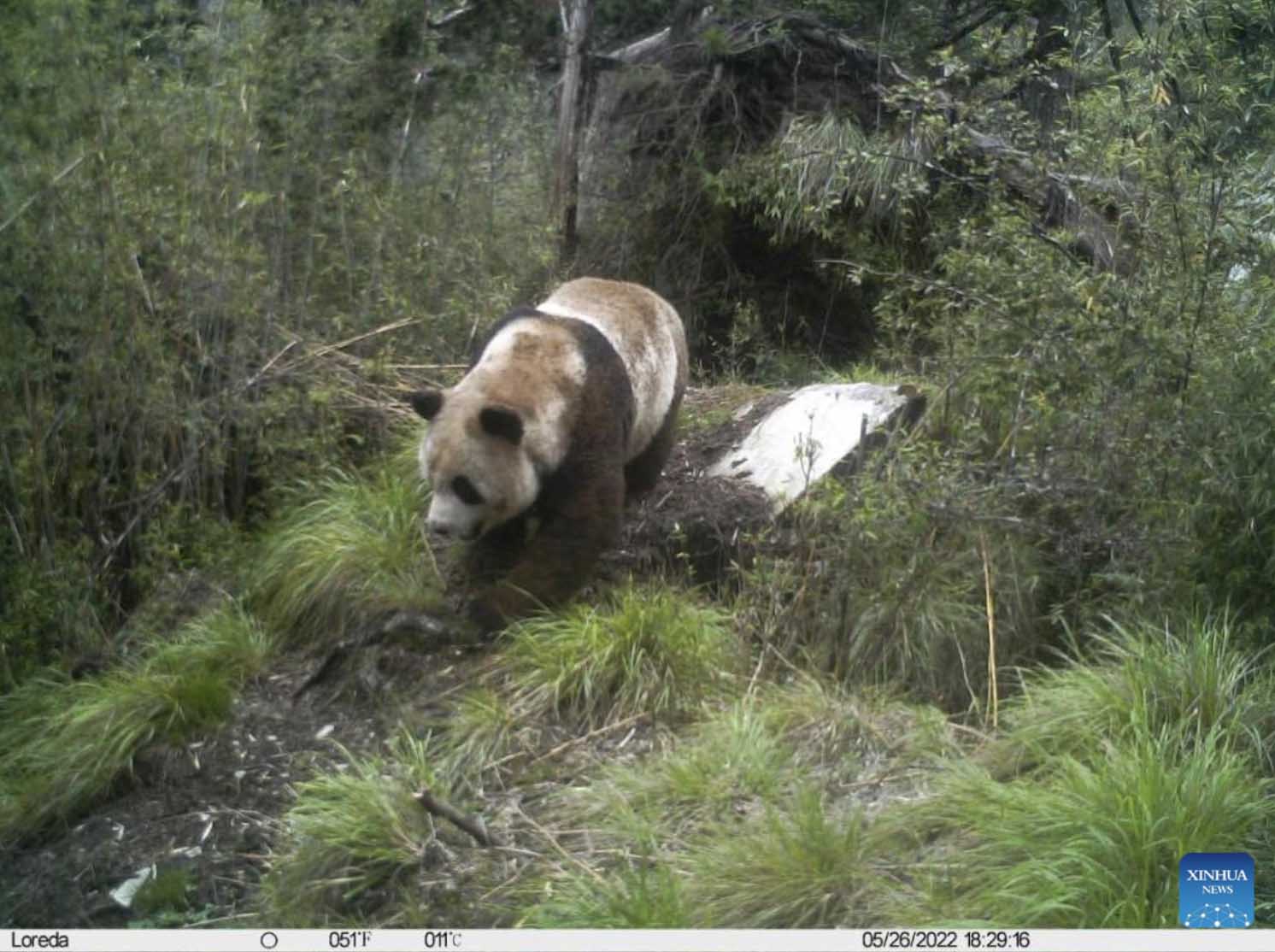 Photo taken by an infrared camera on May 26, 2022 shows a wild giant panda in the Giant Panda National Park's Tangjiahe area in southwest China's Sichuan Province. A wild giant panda was captured by an infrared camera several times in the Giant Panda National Park in southwest China's Sichuan Province.