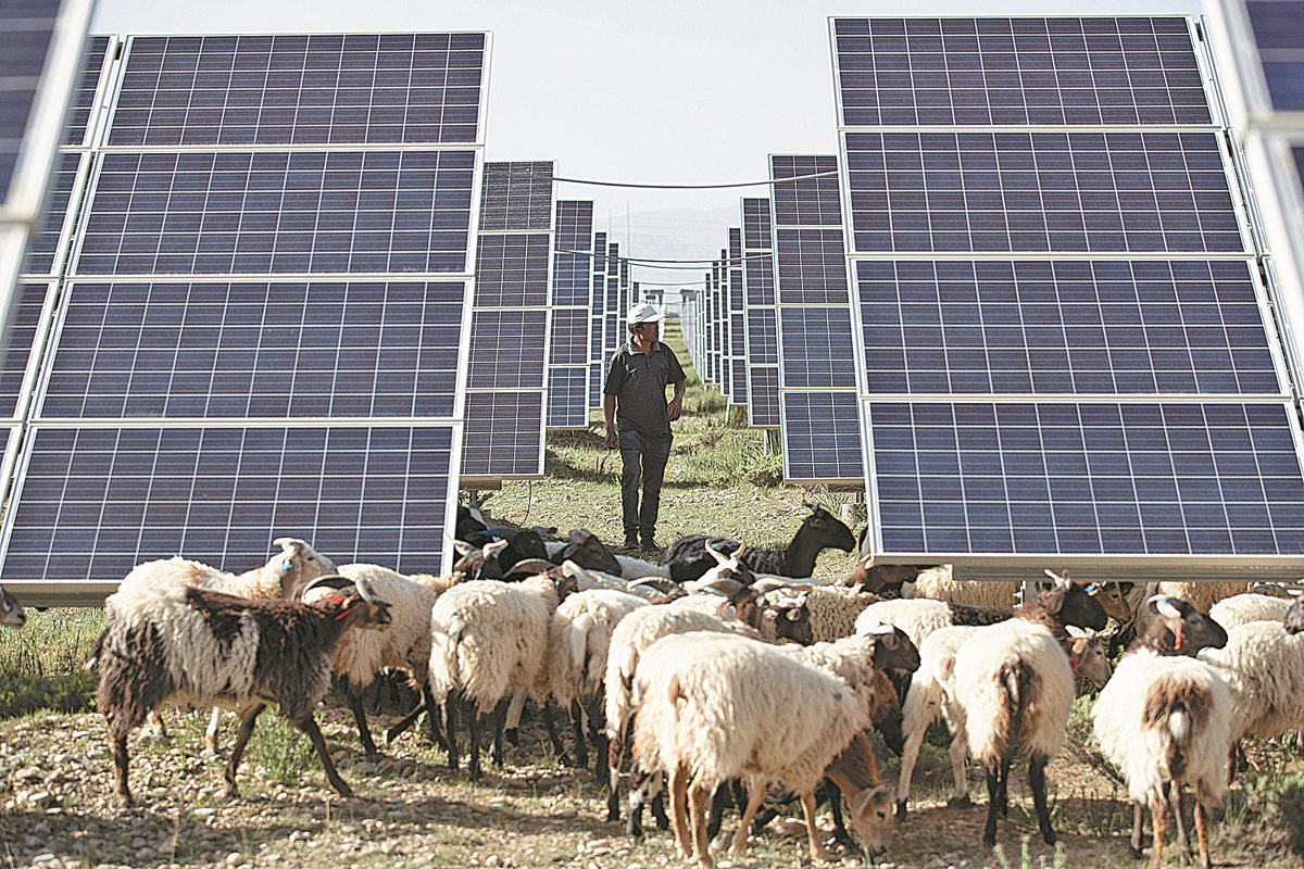 Lin Youkui herds sheep at a photovoltaic electric plant in Gonghe county, Qinghai, on July 5. KUANG LINHUA/CHINA DAILY