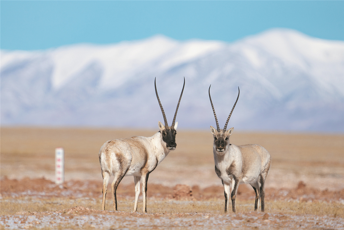 Two male Tibetan antelopes wander in the Sanjiangyuan (Three-River-Source) National Park in Qinghai. SONG ZHONGYONG/XINHUA