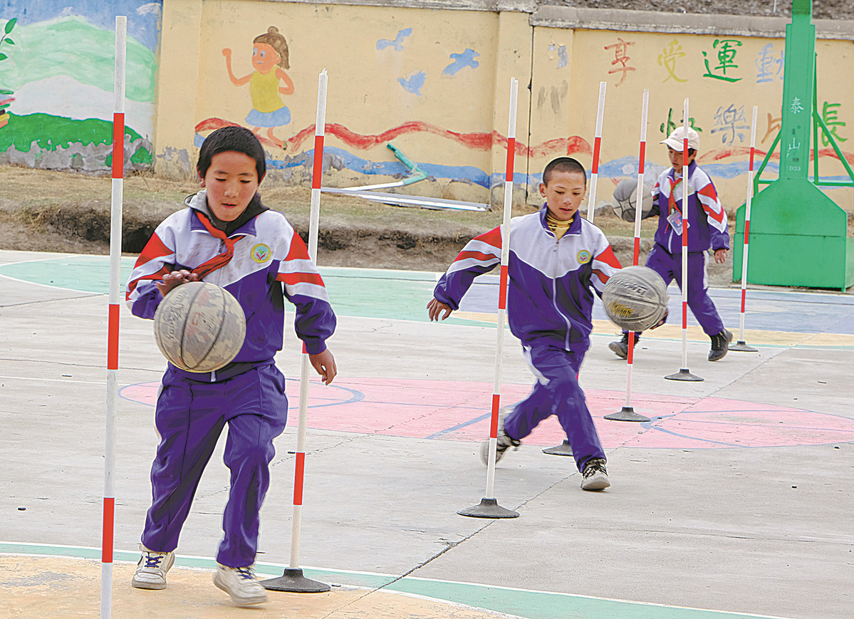 Primary students practice basketball skills at a cultural center in Chindu county, Qinghai province, on April 18. YANGXIU TANDRIN/XINHUA