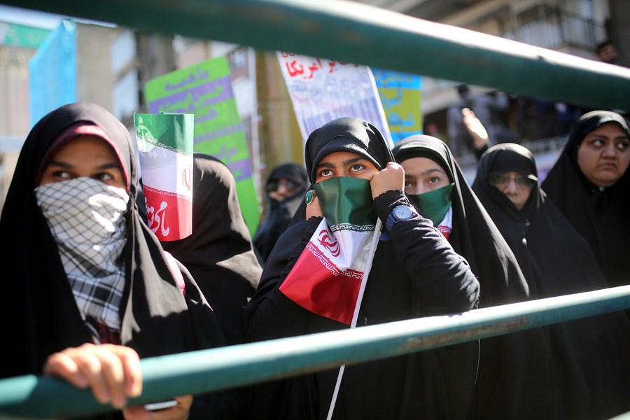 People attend a rally marking the 40th anniversary of the seizure of the former U.S. embassy outside the former U.S. embassy in downtown Tehran, Iran, Nov. 4, 2019. Tens of thousands of Iranians held demonstrations nationwide on Monday to mark the 40th anniversary of the seizure of the former U.S. embassy in Tehran. (Photo by Ahmad Halabisaz/Xinhua)