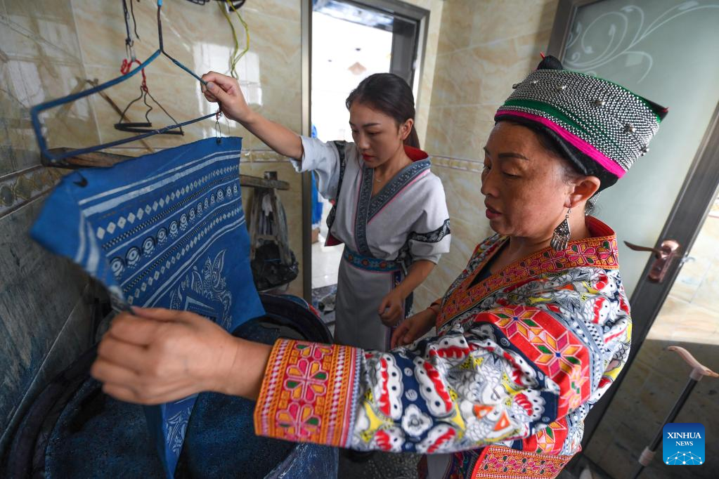 Zhang Juanjuan (back) and her mother make batik products at home in Anshun of southwest China's Guizhou Province, Aug. 18, 2022. Zhang Juanjuan, a girl of Miao ethnic group, decided to return home to take over her parents business related to batik products making after graduation. Batik is an intangible cultural heritage in her hometown. She registered her parents' batik workshop as a batik art company, and founded her own batik DIY studio. To expand her own business, Zhang Juanjuan and her colleagues have designed practical, environment-friendly, and fashionable batik products. Meanwhile, she has been teaching batik-making skills to other villagers, helping them increase their incomes through batik products. She hopes batik of the Miao ethnic group could be known by more people through internet and inherited by more young people. (Xinhua/Yang Wenbin)