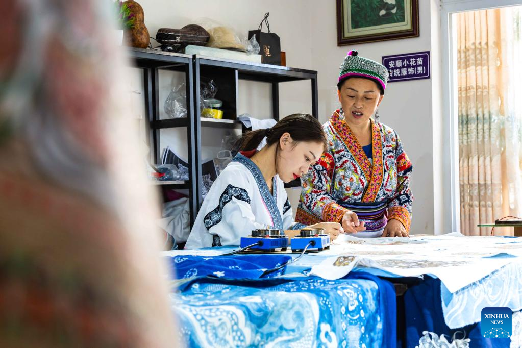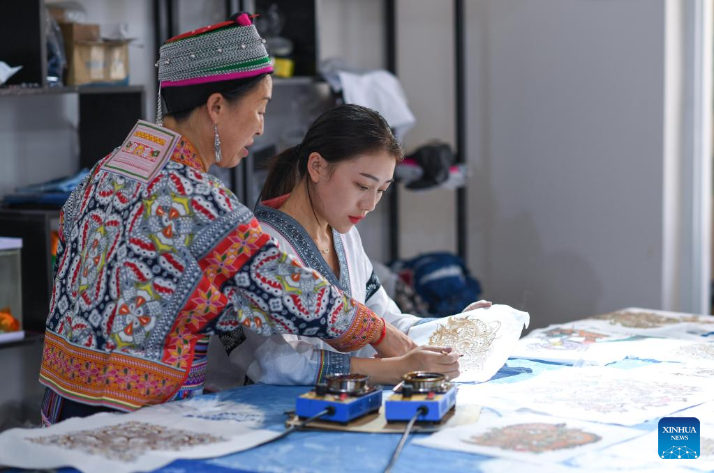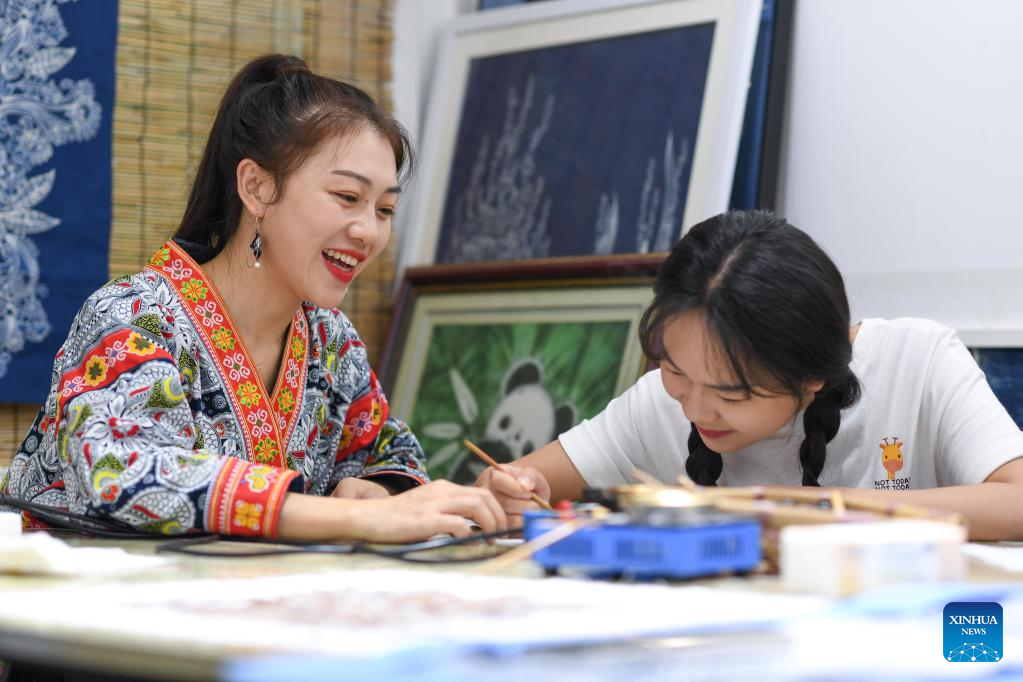 Zhang Juanjuan's mother instructs her to make a batik painting at a batik studio in Anshun of southwest China's Guizhou Province, Aug. 18, 2022. Zhang Juanjuan, a girl of Miao ethnic group, decided to return home to take over her parents business related to batik products making after graduation. Batik is an intangible cultural heritage in her hometown. She registered her parents' batik workshop as a batik art company, and founded her own batik DIY studio. To expand her own business, Zhang Juanjuan and her colleagues have designed practical, environment-friendly, and fashionable batik products. Meanwhile, she has been teaching batik-making skills to other villagers, helping them increase their incomes through batik products. She hopes batik of the Miao ethnic group could be known by more people through internet and inherited by more young people. (Photo by Chen Xi/Xinhua)