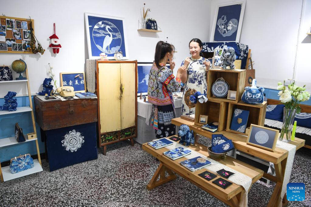 Zhang Juanjuan (L) introduces her self-designed batik creative cultural products to a customer at a batik DIY studio in Anshun of southwest China's Guizhou Province, Aug. 18, 2022. Zhang Juanjuan, a girl of Miao ethnic group, decided to return home to take over her parents business related to batik products making after graduation. Batik is an intangible cultural heritage in her hometown. She registered her parents' batik workshop as a batik art company, and founded her own batik DIY studio. To expand her own business, Zhang Juanjuan and her colleagues have designed practical, environment-friendly, and fashionable batik products. Meanwhile, she has been teaching batik-making skills to other villagers, helping them increase their incomes through batik products. She hopes batik of the Miao ethnic group could be known by more people through internet and inherited by more young people. (Xinhua/Yang Wenbin)