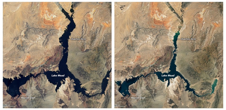 Combo photo taken by NASA satellites shows the water level change between July 6, 2000 (L) and July 3, 2022 in Lake Mead, Nevada, the United States. (Photo credit: NASA Earth Observatory)