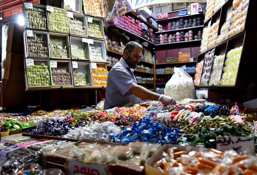 A man sells sweets for the upcoming Eid al-Fitr at a market in Damascus, Syria, April 26, 2022. (Photo by Ammar Safarjalani/Xinhua)