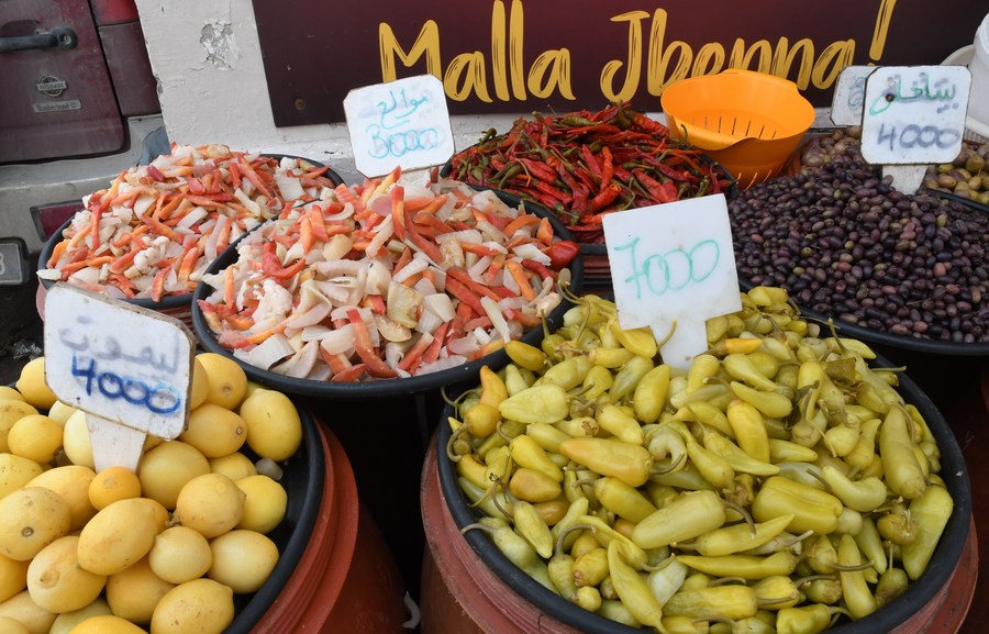 Photo shows pickles at a market in Tunis, Tunisia, April 9, 2022. (Photo by Adel Ezzine/Xinhua)