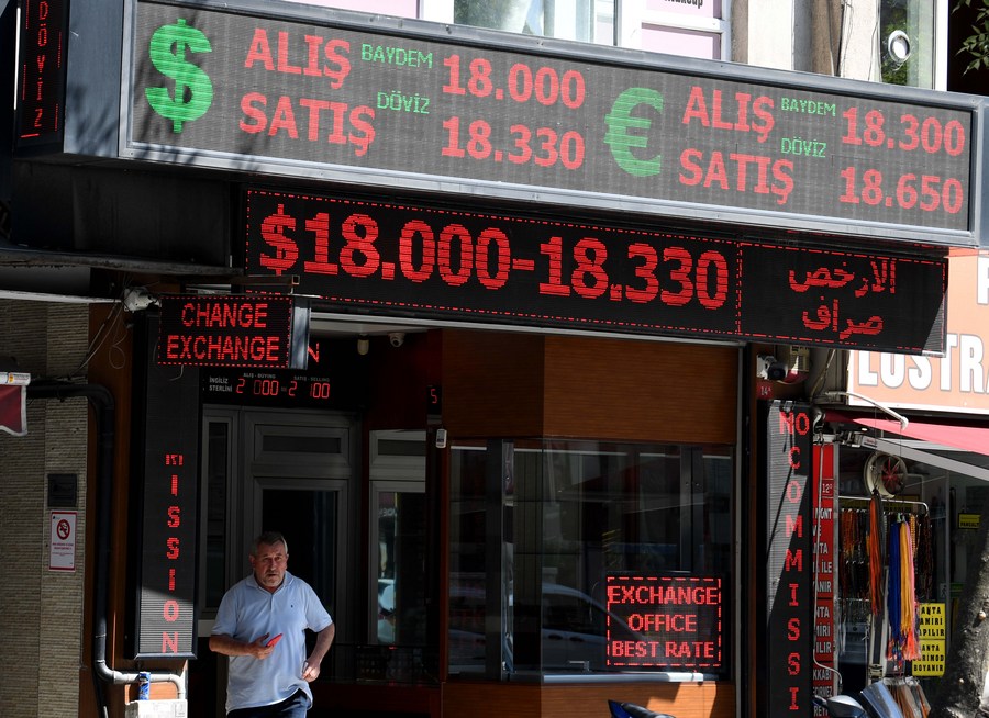 Türkiye's annual inflation hit 79.6 percent in July, the highest in 24 years. One dollar was traded at 18.09 Turkish liras on Sunday morning, marking an over 100-percent value loss on the part of the lira compared to a year ago when the exchange rate was 8.45 liras per dollar.