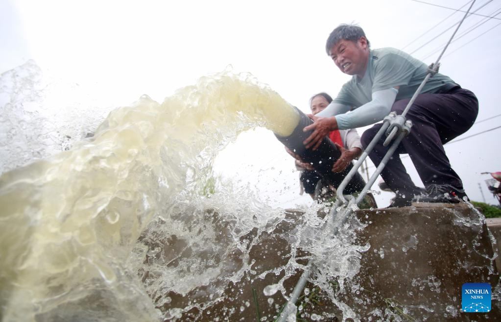Farmers pump water into their rice field in Jiangdu District, Yangzhou City of east China's Jiangsu Province, Aug. 23, 2022. (Photo by Meng Delong/Xinhua)