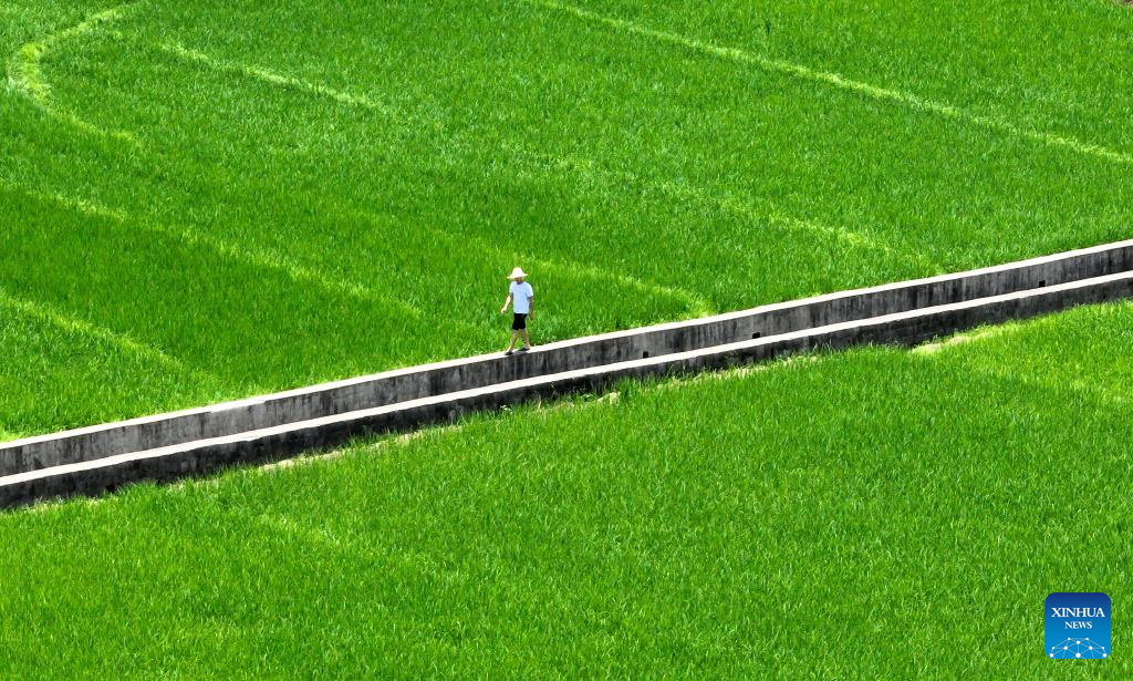 Aerial photo taken on Aug. 23, 2022 shows a villager checking water flow in a canal for irrigation in Chuanshan Township, Liujiang District of Liuzhou City in south China's Guangxi Zhuang Autonomous Region. (Photo by Li Hanchi/Xinhua)