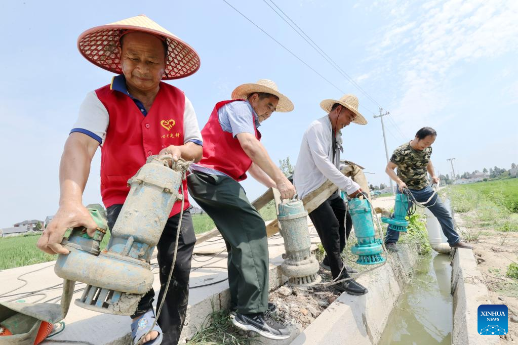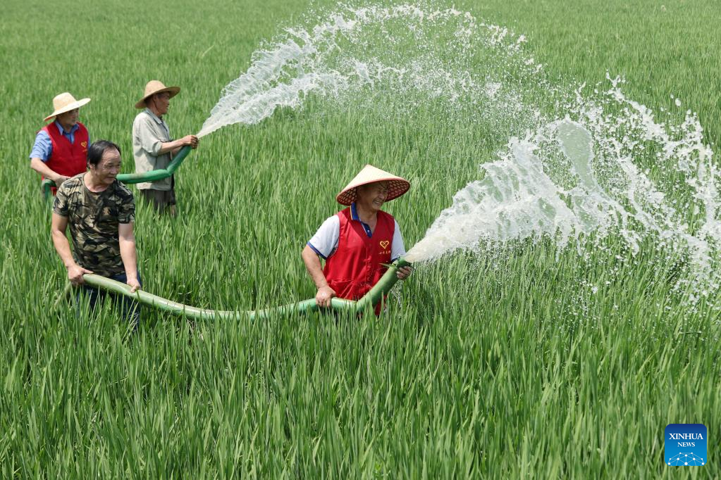 Villagers and volunteers irrigate rice fields in Xin'an Township, Deqing County, Huzhou City of east China's Zhejiang Province, Aug. 23, 2022. (Photo by Xie Shangguo/Xinhua)