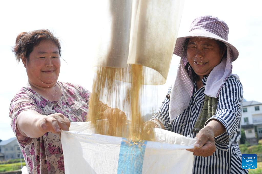 Farmers pack rice in Wangcao Township, Suiyang County of southwest China's Guizhou Province, Aug. 23, 2022. (Xinhua/Yang Ying)