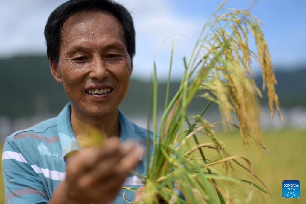 A farmer checks the maturity of rice grains in Wangcao Township, Suiyang County of southwest China's Guizhou Province, Aug. 23, 2022. (Xinhua/Yang Ying)
