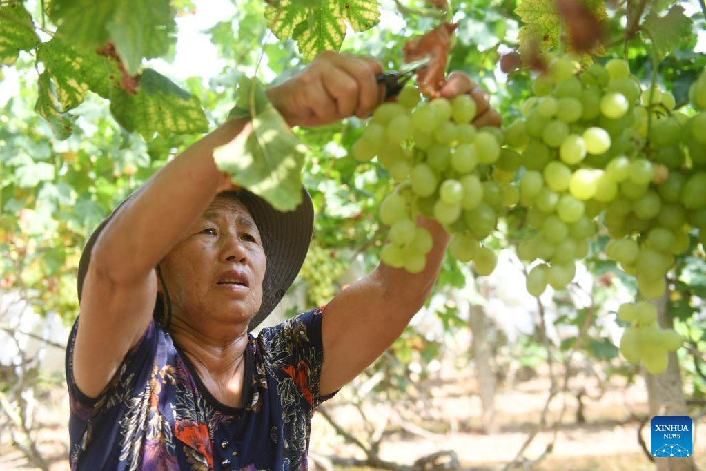A villager harvests grapes at a vineyard in Maozhushan Village of Caiwan Township in Quanzhou County, south China's Guangxi Zhuang Autonomous Region, Aug. 23, 2022. More than 2,000 mu (133 hectares) of grape fields entered the harvest season here recently. (Xinhua/Lu Boan)