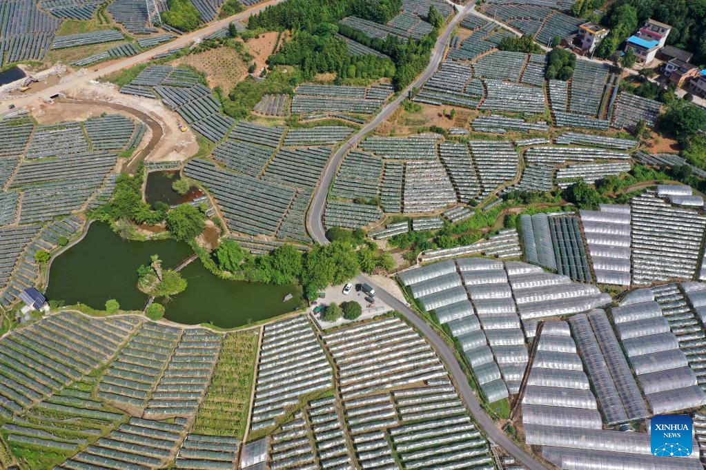 Aerial photo taken on Aug. 23, 2022 shows the vineyard in Maozhushan Village of Caiwan Township in Quanzhou County, south China's Guangxi Zhuang Autonomous Region. More than 2,000 mu (133 hectares) of grape fields entered the harvest season here recently. (Xinhua/Lu Boan)