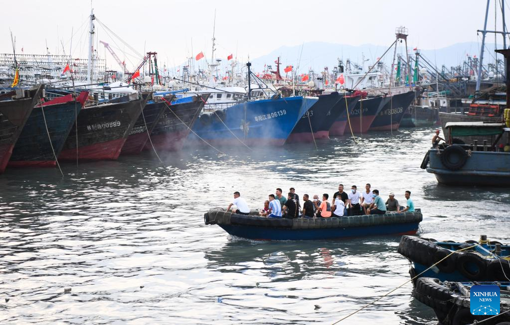 Maritime workers return to a port for shelter in Yangjiang City, south China's Guangdong Province, Aug. 24, 2022.