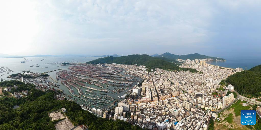 In this aerial photo, fishing boats have returned to a port for shelter in Yangjiang City, south China's Guangdong Province, Aug. 24, 2022.(Xinhua/Deng Hua)