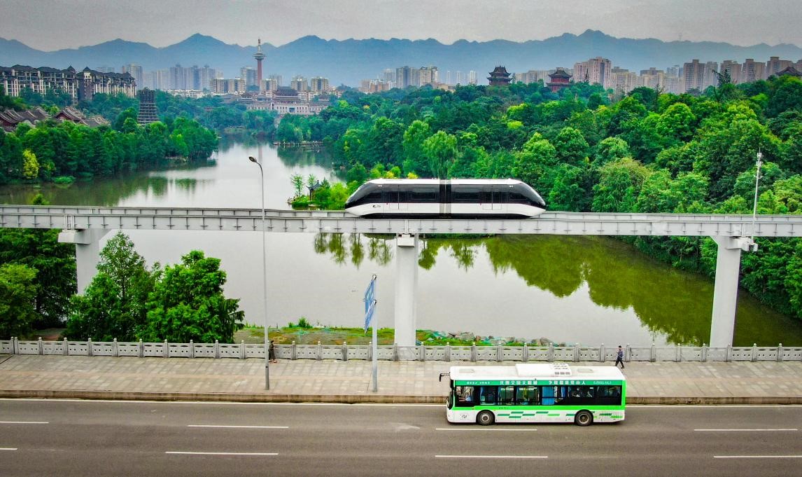 A "skyshuttle" and a new energy bus run in Bishan district, southwest China's Chongqing municipality, July 14, 2021. (People's Daily Online/Hu Yuejian)