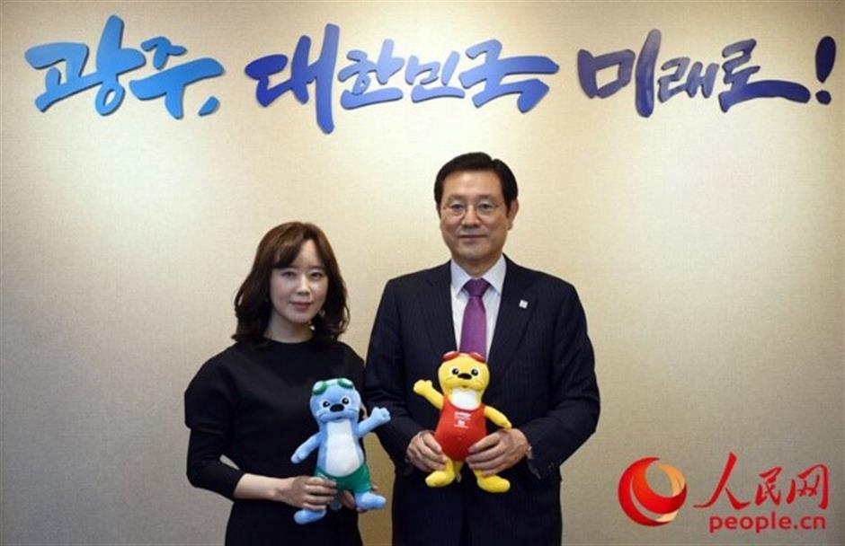 Zhou Yubo (left) conducts an interview with Lee Yong-seop, mayor of Gwangju, in 2019.