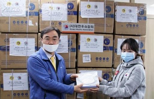 On behalf of the China Martial Arts Association, Zhou Yubo (right) donates 12,000 N95 masks to its South Korean counterpart in 2020. The masks were printed with uplifting slogans, in both Chinese and Korean, reading "Join hands in fighting the pandemic! Go!"