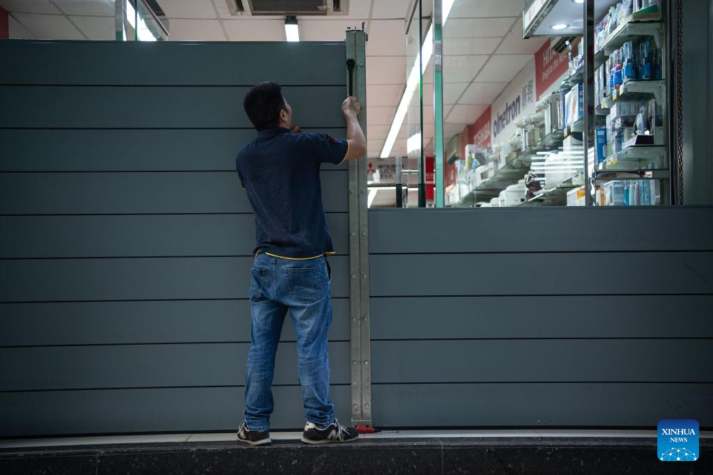 A staff member installs a waterproof gate at a store in Macao, south China, Aug. 24, 2022. China on Wednesday activated a Level-IV emergency response to possible geological disasters triggered by Typhoon Ma-on, according to the Ministry of Natural Resources.