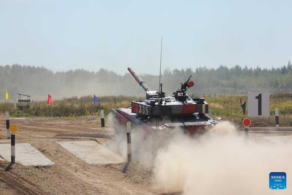 The Chinese team takes part in the tank biathlon of the International Army Games 2022 at the Alabino training ground in the Moscow region, Russia, Aug. 24, 2022. The Chinese team on Wednesday advanced to the tank biathlon's final contest in the ongoing International Army Games 2022 held in Russia. (Photo by Luo Kun/Xinhua)