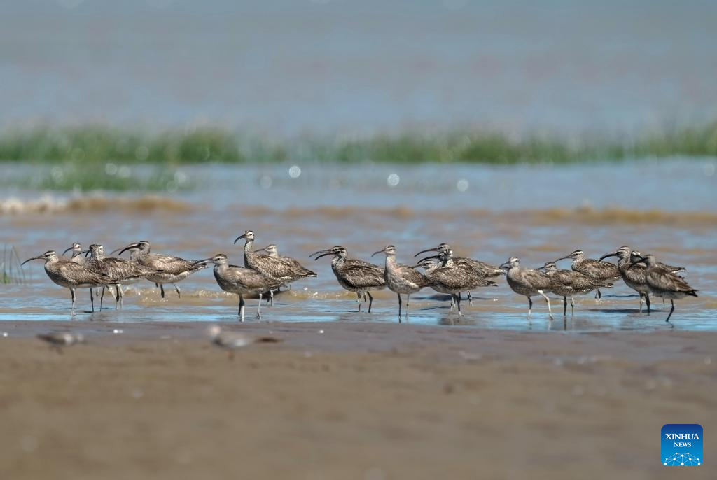 A flock of whimbrels forage at the Minjiang River estuary wetland in southeast China's Fujian Province, Aug. 25, 2022. The wetland locates on a bird migration route between East Asia and Australia. (Xinhua/Wei Peiquan)