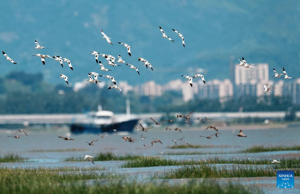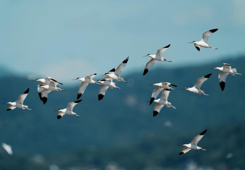 A flock of avocets fly in the sky at the Minjiang River estuary wetland in Fuzhou, southeast China's Fujian Province, Aug. 25, 2022. The wetland locates on a bird migration route between East Asia and Australia. (Xinhua/Wei Peiquan)