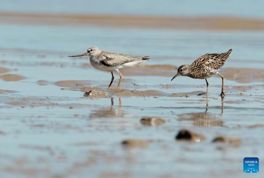 A Terek sandpiper and a sharp-tailed sandpiper forage at the Minjiang River estuary wetland in southeast China's Fujian Province, Aug. 25, 2022. The wetland locates on a bird migration route between East Asia and Australia. (Xinhua/Wei Peiquan)