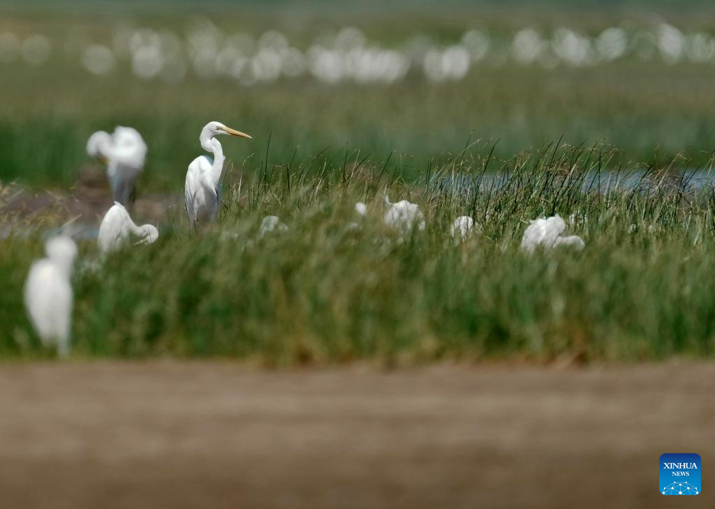 Egrets are pictured at the Minjiang River estuary wetland in southeast China's Fujian Province, Aug. 25, 2022. The wetland locates on a bird migration route between East Asia and Australia. (Xinhua/Wei Peiquan)