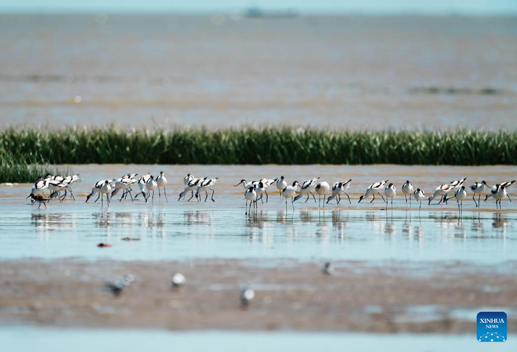A flock of avocets forage at the Minjiang River estuary wetland in southeast China's Fujian Province, Aug. 25, 2022. The wetland locates on a bird migration route between East Asia and Australia. (Xinhua/Wei Peiquan)
