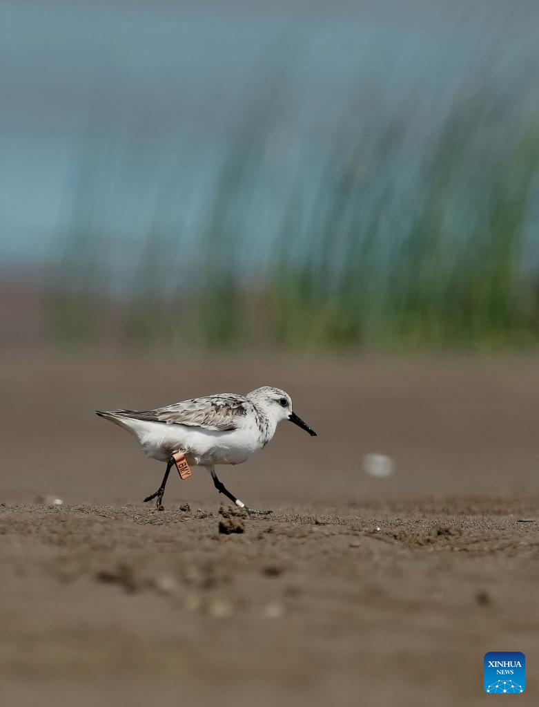 A sanderling forages at the Minjiang River estuary wetland in southeast China's Fujian Province, Aug. 25, 2022. The wetland locates on a bird migration route between East Asia and Australia. (Xinhua/Wei Peiquan)