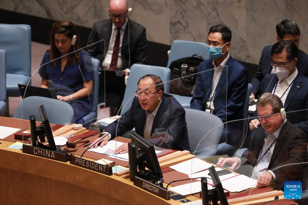 Zhang Jun (C), China's permanent representative to the United Nations, speaks at a UN Security Council meeting on the situation in the Middle East, including the Palestinian question, at the UN headquarters in New York, on Aug. 25, 2022. The Chinese envoy on Thursday called on the international community to take effective measures to put the settlement of the Palestinian question back on track. (Xinhua/Xie E)