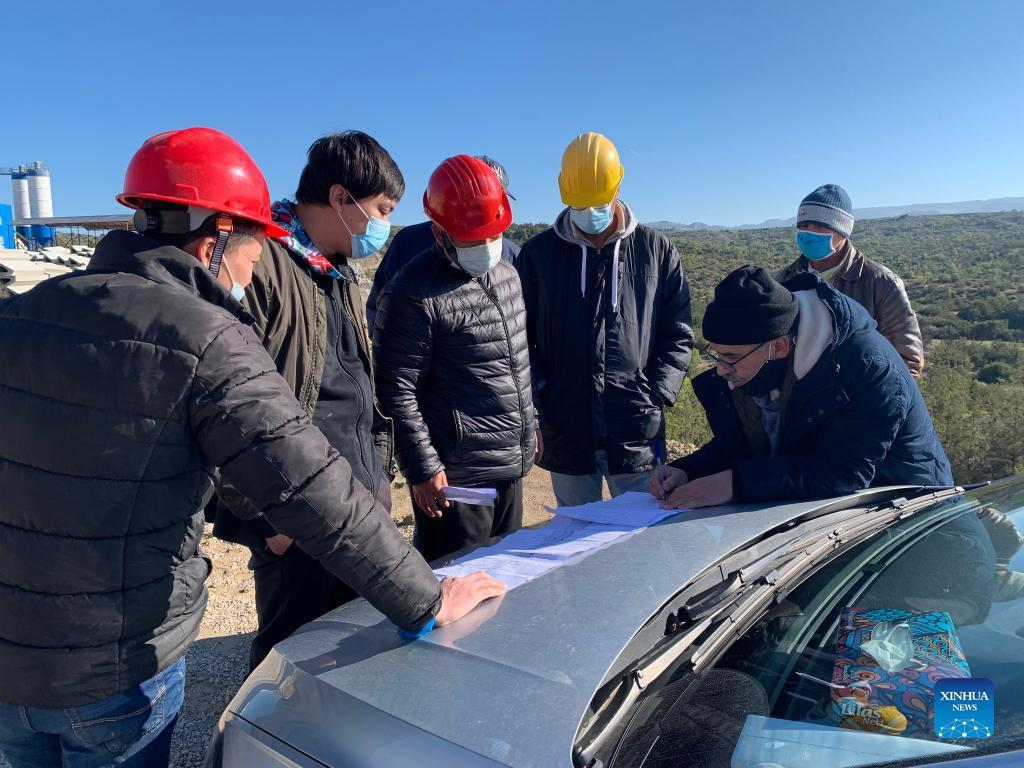 Engineers from China and Tunisia discuss the construction scheme at the construction site of the Mellegue dam in Tunisia's northwestern province of El Kef, on Jan. 20, 2021. In May 2016, China's power construction company Sinohydro won the bid to build a new dam over the river to replace the run-down old one. The Mellegua dam is scheduled for completion in September 2023. With a maximum capacity of 305 million cubic meters of water, it will play a significant role in protecting the ecological environment in Tunisia. (Sinohydro/Handout via Xinhua)