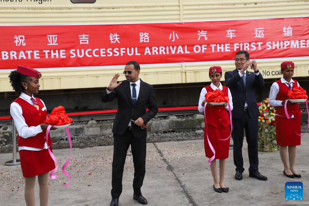 Abdi Zenebe (2nd L), the chief executive officer of Ethiopia-Djibouti Railway Share Company, attends a ceremony marking the arrival of the first vehicle shipment at the Indode Freight Station on the outskirts of Addis Ababa, Ethiopia, on Aug. 25, 2022. The Chinese-built Ethiopia-Djibouti railway on Thursday started vehicle shipment from ports in Djibouti to Addis Ababa, the Ethiopian capital. The first vehicle shipment arrived at the Indode Freight Station on the outskirts of Addis Ababa. (Xinhua/Michael Tewelde)
