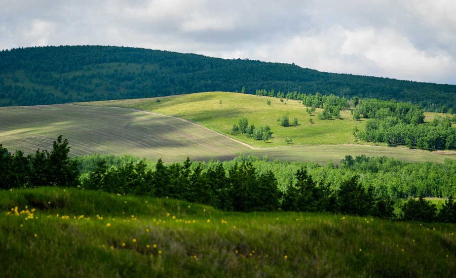 Photo taken on June 10, 2021 shows the summer scenery of the forest and grassland along the No. 332 national highway in Hulun Buir, north China's Inner Mongolia Autonomous Region. (Xinhua/Lian Zhen)
