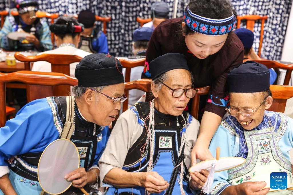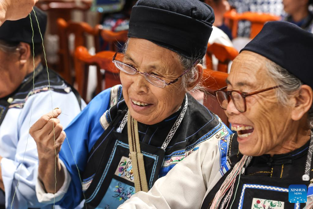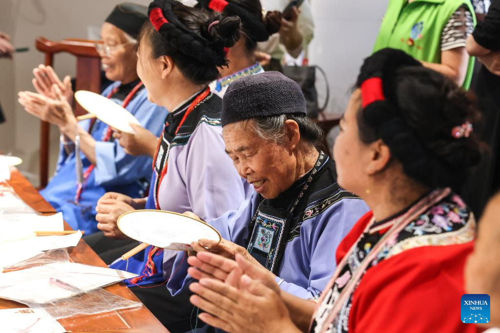 Women converse as they learn to make embroidery on fans in Shanwangmiao Village of Qingyan Township in Guiyang, capital of southwest China's Guizhou Province, Aug. 26, 2022. In recent years, local authorities of Guiyang have carried out a project to boost creative cultural products and help rural women increase their income. More than 2,000 local women have participated in the project, working on creative cultural products such as embroidery and batik. (Xinhua/Ou Dongqu)