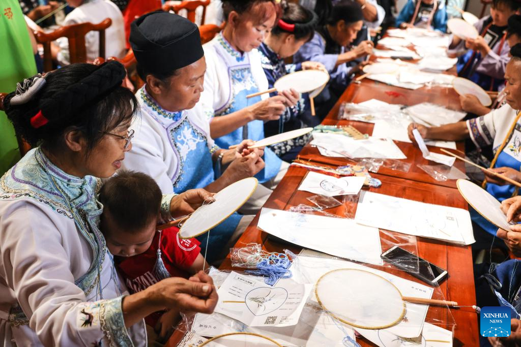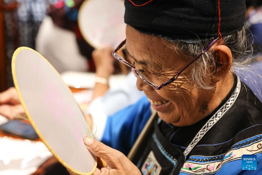 Women embroider on fans in Shanwangmiao Village of Qingyan Township in Guiyang, capital of southwest China's Guizhou Province, Aug. 26, 2022. In recent years, local authorities of Guiyang have carried out a project to boost creative cultural products and help rural women increase their income. More than 2,000 local women have participated in the project, working on creative cultural products such as embroidery and batik. (Xinhua/Ou Dongqu)