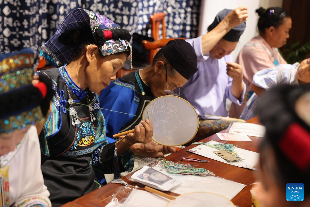 Women make creative cultural products in Shanwangmiao Village of Qingyan Township in Guiyang, capital of southwest China's Guizhou Province, Aug. 26, 2022. In recent years, local authorities of Guiyang have carried out a project to boost creative cultural products and help rural women increase their income. More than 2,000 local women have participated in the project, working on creative cultural products such as embroidery and batik. (Xinhua/Ou Dongqu)