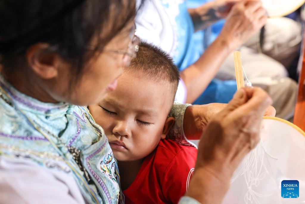 A woman carrying her child in the arm embroiders on a fan in Shanwangmiao Village of Qingyan Township in Guiyang, capital of southwest China's Guizhou Province, Aug. 26, 2022. In recent years, local authorities of Guiyang have carried out a project to boost creative cultural products and help rural women increase their income. More than 2,000 local women have participated in the project, working on creative cultural products such as embroidery and batik. (Xinhua/Ou Dongqu)