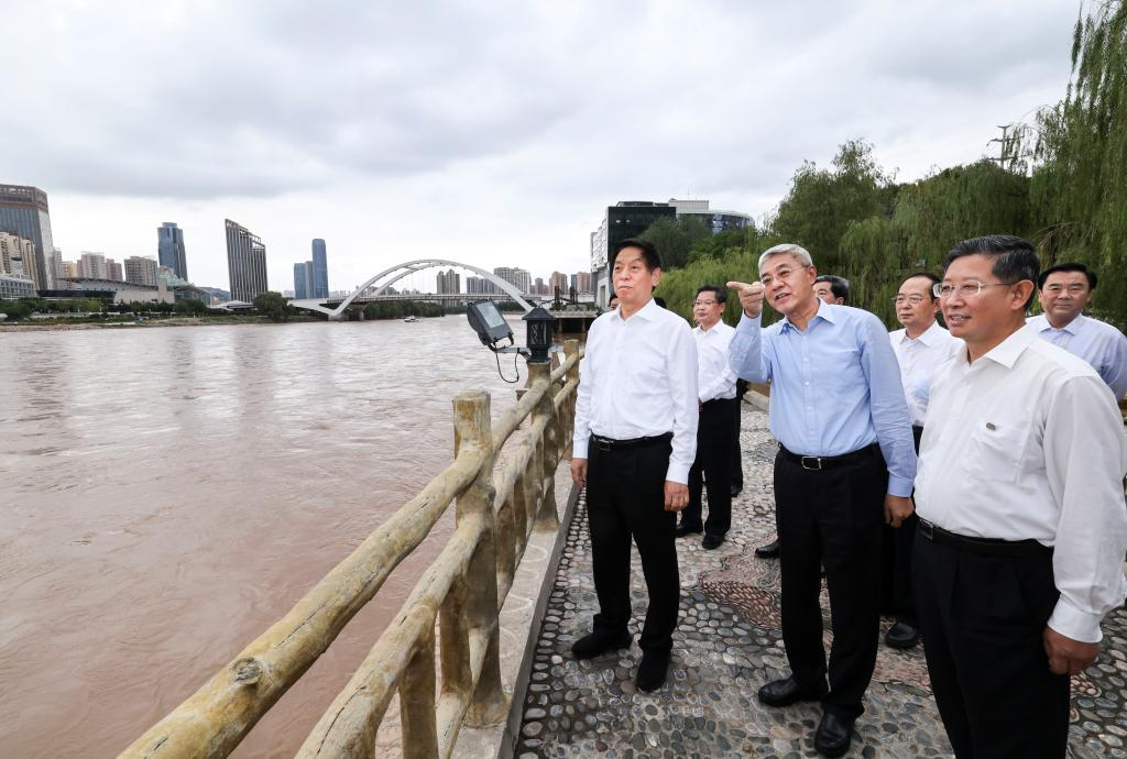 Li Zhanshu, a member of the Standing Committee of the Political Bureau of the Communist Party of China Central Committee and chairman of the National People's Congress (NPC) Standing Committee, learns about the province's ecological environment improvements, wetland protection work, water resource utilization, cultural inheritance and protection of the Yellow River in Lanzhou City during his inspection tour in northwest China's Gansu Province, Aug. 27, 2022. Li has stressed protecting the Yellow River in accordance with the law, and using the river to benefit the people. (Xinhua/Pang Xinglei)