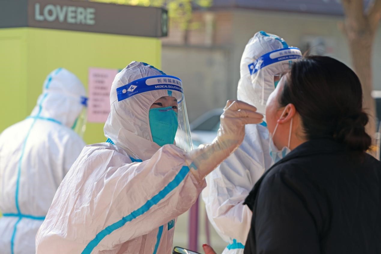 A medical worker of a medical team assisting Shanghai's COVID-19 relief from east China's Jiangsu province takes nucleic acid samples for residents, April 4, 2022. (People's Daily Online/Wang Yuning)