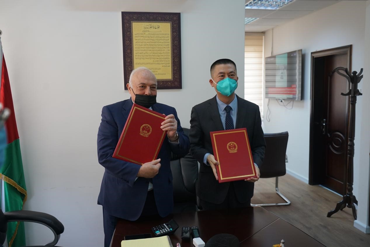 Guo Wei (right), Head of the Office of the People’s Republic of China to the State of Palestine and Palestinian Finance Minister Shukri Bishara sign a delivery note for China's emergency humanitarian cash aid to Palestine, June 10, 2021. (Photo courtesy of the Office of the People’s Republic of China to the State of Palestine)