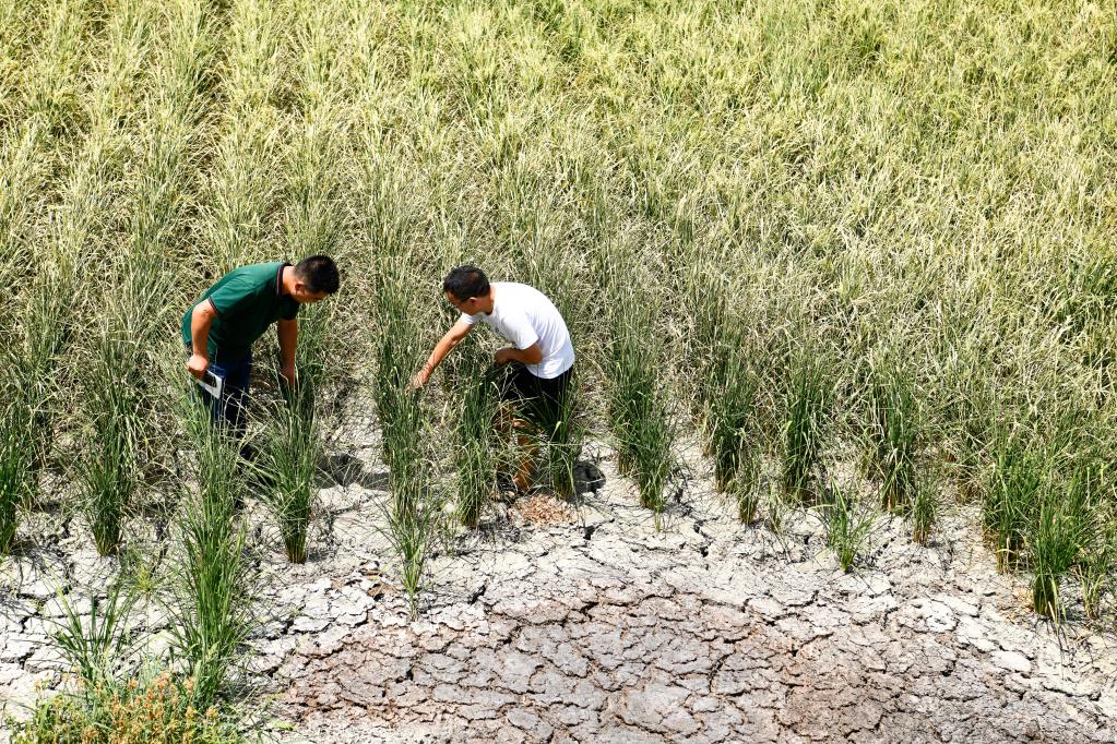 Officials check rice damage caused by drought in Tangshan Village of Shixi Township, Tongzi County of Zunyi City, southwest China's Guizhou Province, Aug. 24, 2022. China's national observatory issued an orange alert for drought on Friday as heatwaves persisted in multiple regions.