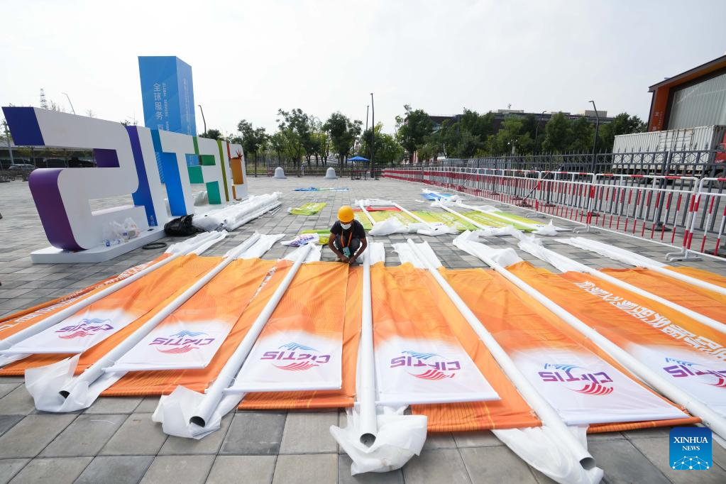A staff member makes preparation for the 2022 China International Fair for Trade in Services (CIFTIS) at Shougang Park in Beijing, capital of China, Aug. 29, 2022.