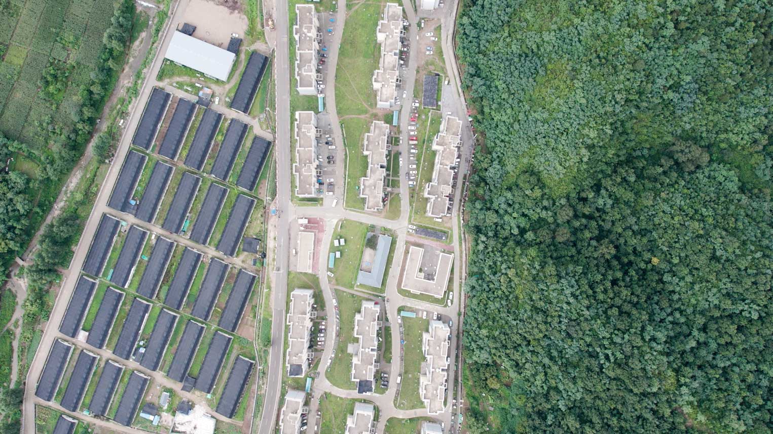 Aerial photo taken on July 27, 2022, shows greenhouses for mushroom cultivation (left) and relocated buildings (middle) in Malan Village, Fuping County, north China’s Hebei Province. (People’s Daily Online / Liu Ning)