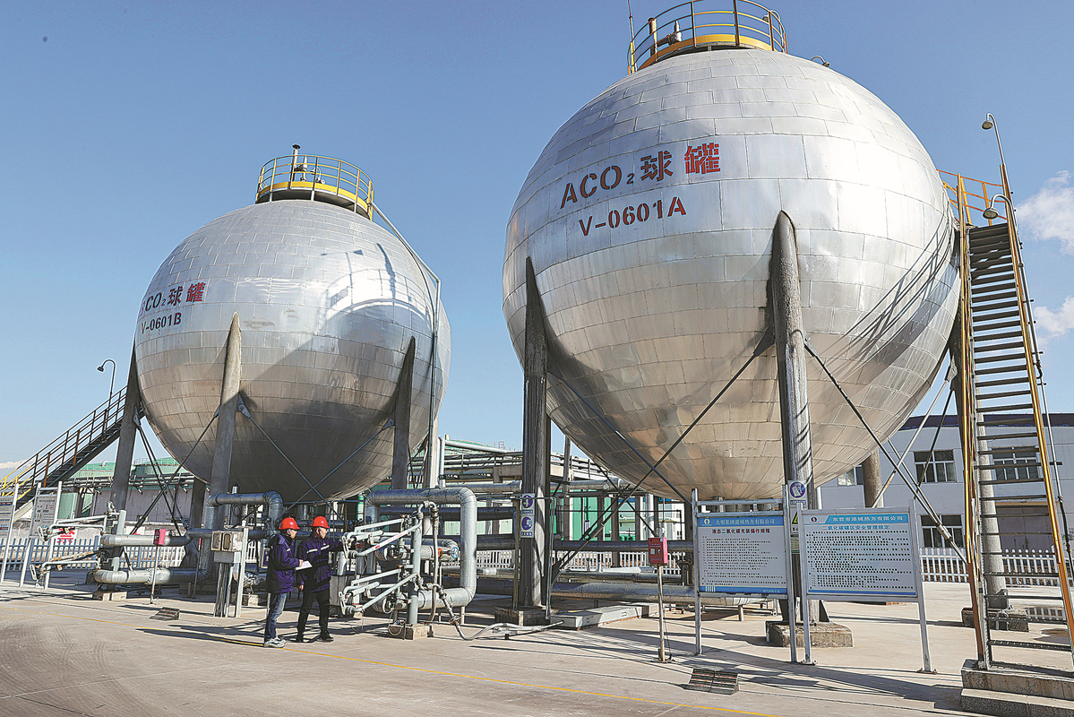 Technicians inspect a CO2 storage facility in Dongying, Shandong province, in December. [ZHOU GUANGXUE/FOR CHINA DAILY]