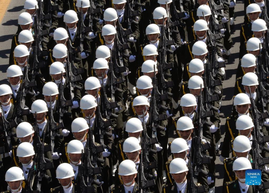 Turkish soldiers march during a parade to mark the 100th anniversary of Victory Day in Ankara, Trkiye, on Aug. 30, 2022. Trkiye celebrated on Tuesday the 100th anniversary of Victory Day, marking the Turkish victory against Greek forces in a decisive battle during the Turkish War of Independence in 1922. (Photo by Mustafa Kaya/Xinhua)